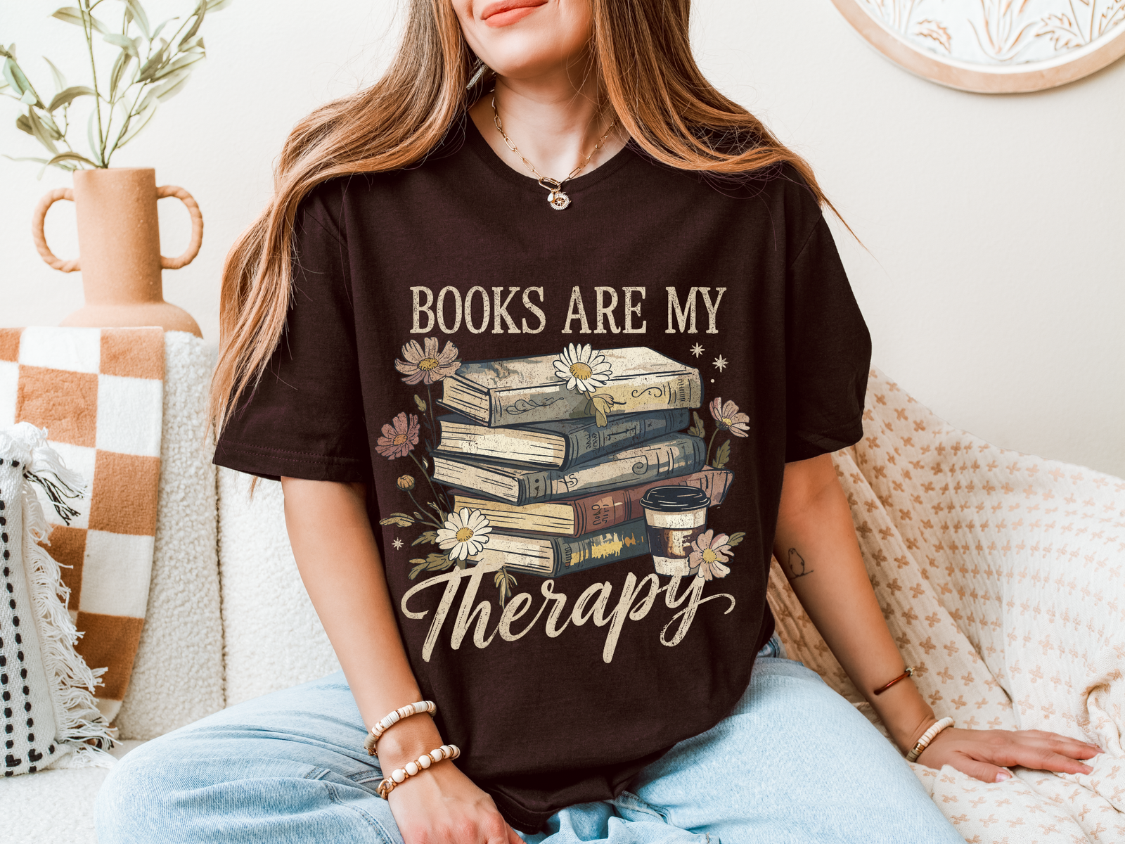 The design features a charming vintage-style stack of books surrounded by daisies and a cozy cup of coffee, paired with the comforting phrase “Books Are My Therapy.” It’s a gentle nod to every book lover who knows that sometimes, a good story is the best escape.