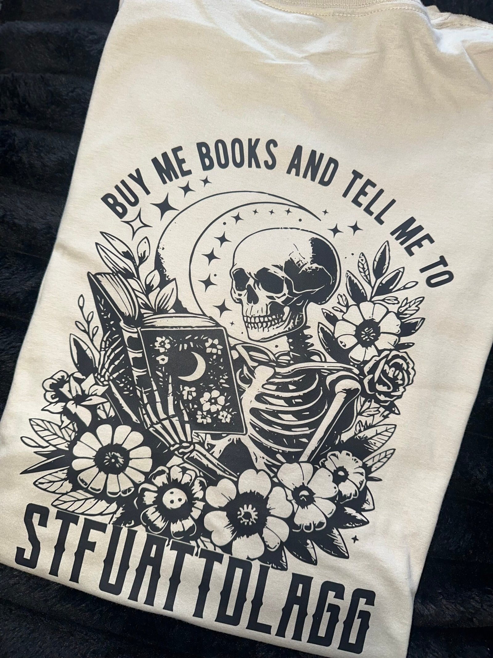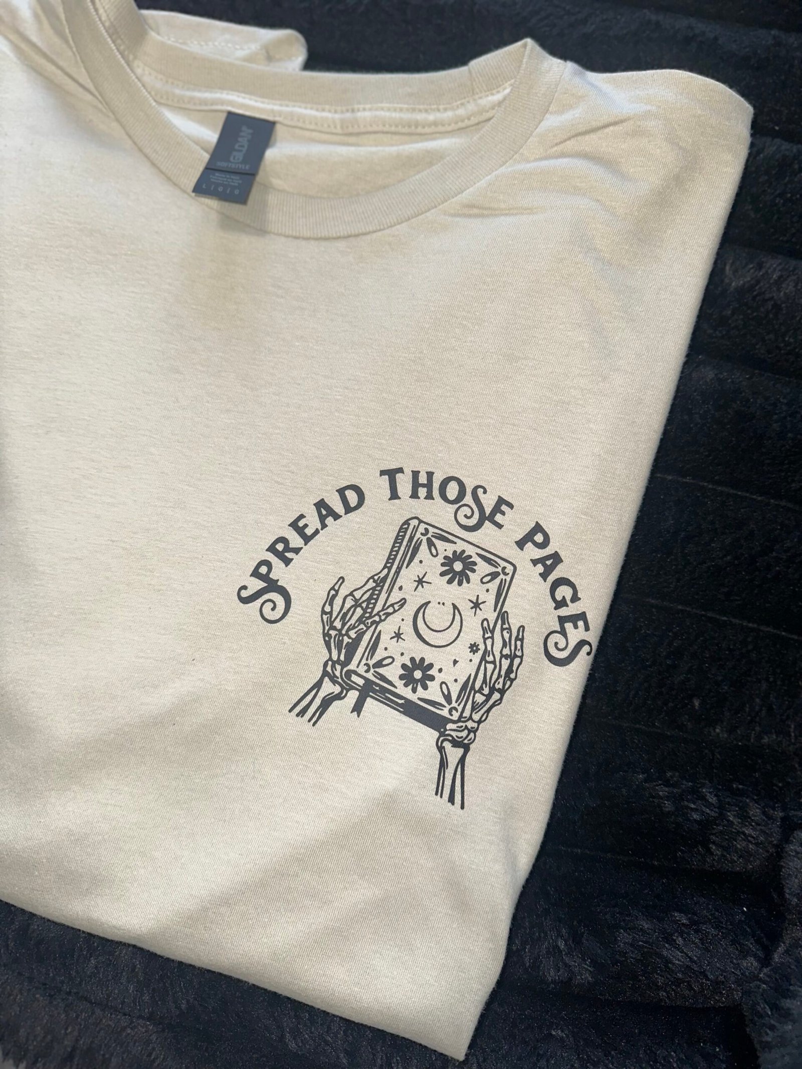 For the book lover with a dark sense of humor — this Spead Those Pages & STFUATTDLAGG mash up in Sand says it all. Featuring a bold skeleton reading beneath the moon surrounded by florals, it’s the perfect mix of cozy, gothic, and witty. Spread Those Pages will be a pocket, STFUATTDLAGG is the back design.
